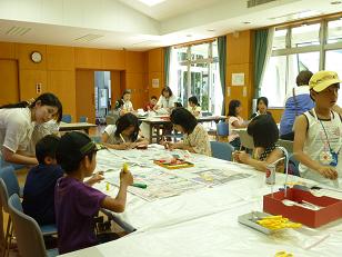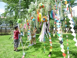 梅雨が明けたかのような晴天の日曜日 恒例センターの七夕まつりです。 朝からちびっこ達がたくさん集まってくれました。 まず最初に願い事を書いた短冊を竹に結び、可愛らしい手を合わせ。 次に輪投げ☆折り紙☆紙細工 みんな上手にできました♪。 この日は170名余りの方々でセンターの七夕祭は大盛況♪皆さん楽しんでいただけました。 何をお願いしたのかな?願い事の短冊は大きな竹の木に結びました♪ 紙工作 みんな器用に作りました狙いを定めてエイッ♪