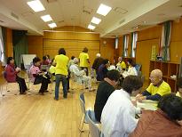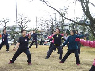 センター登録の団体、中国健康体操と太極拳の皆さんによる模範演技に合わせてギャラリーも見よう見まねで体を動かしひと汗かきます。