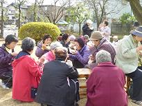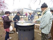 雲の切れ間から差し込む冬の日差しの中センターの芝生の庭で芋煮を囲む笑顔があちこちに