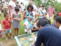夏のお祭りには欠かせない楽しいお店がふれあいセンターの芝生の庭のあちこちに開店。