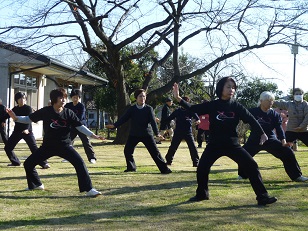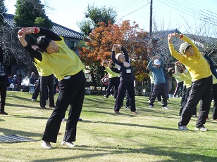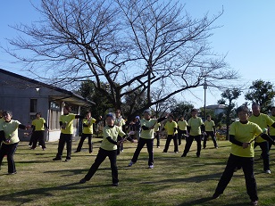 まずは健康体操から センターで活動している太極拳と中国体操の皆さんの体操に合わせてみんなで体操に汗を流します。