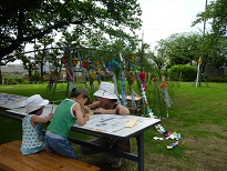 七夕の竹にはたくさんの願い事の短冊が折り紙飾りと一緒に下げられて、願いが届きます様にと芝生の庭に立てられました♪