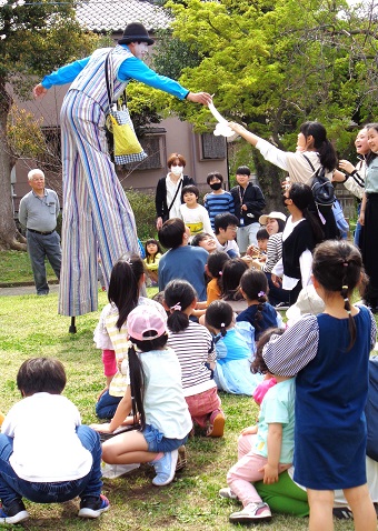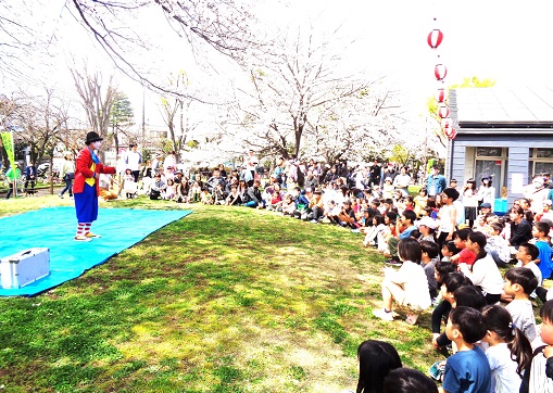 ふれあいセンタ−桜まつりを盛り上げて下さった、ピエロのマー君 明治薬科大学の皆さんありがとうございました。